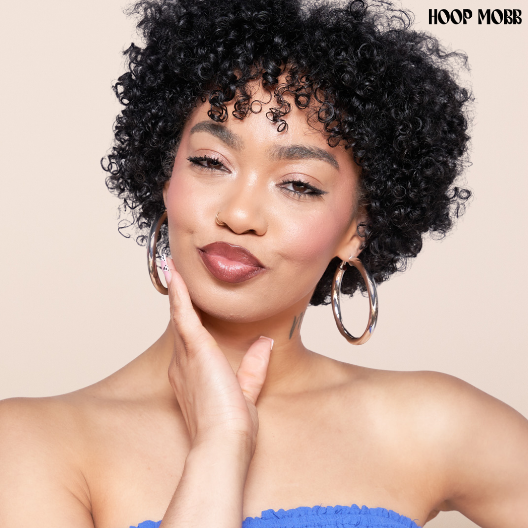 Wipe clean with a dry cloth and store back in your Hoop Mobb pouch after each wear to maintain your hoops. Water, oil and makeup can cause fading and discoloration.